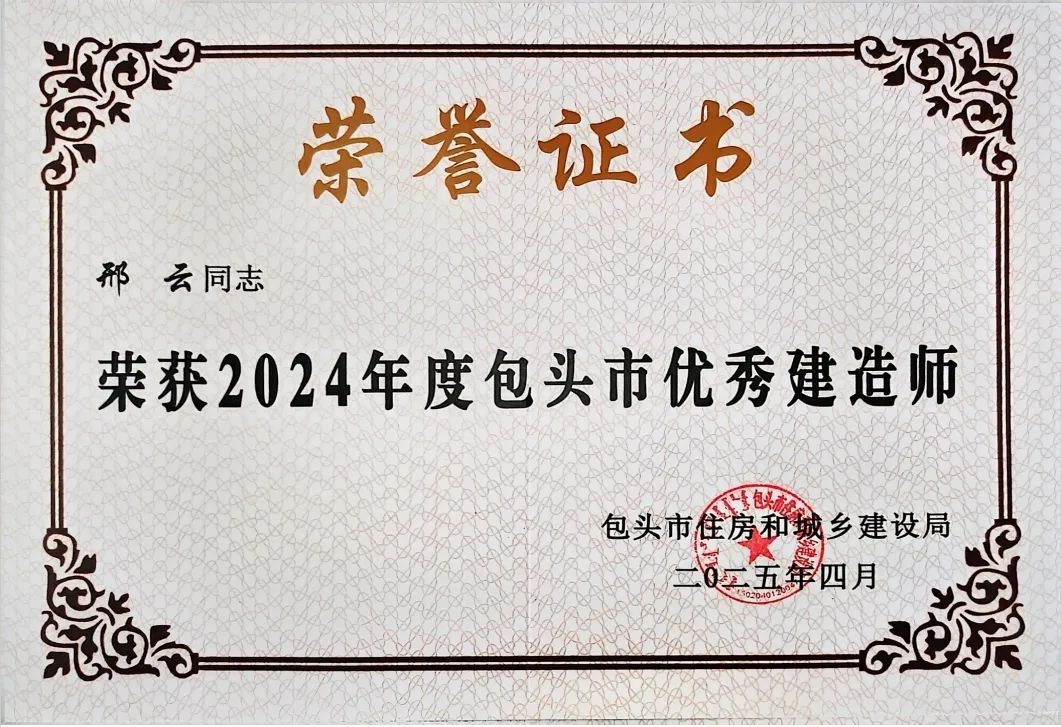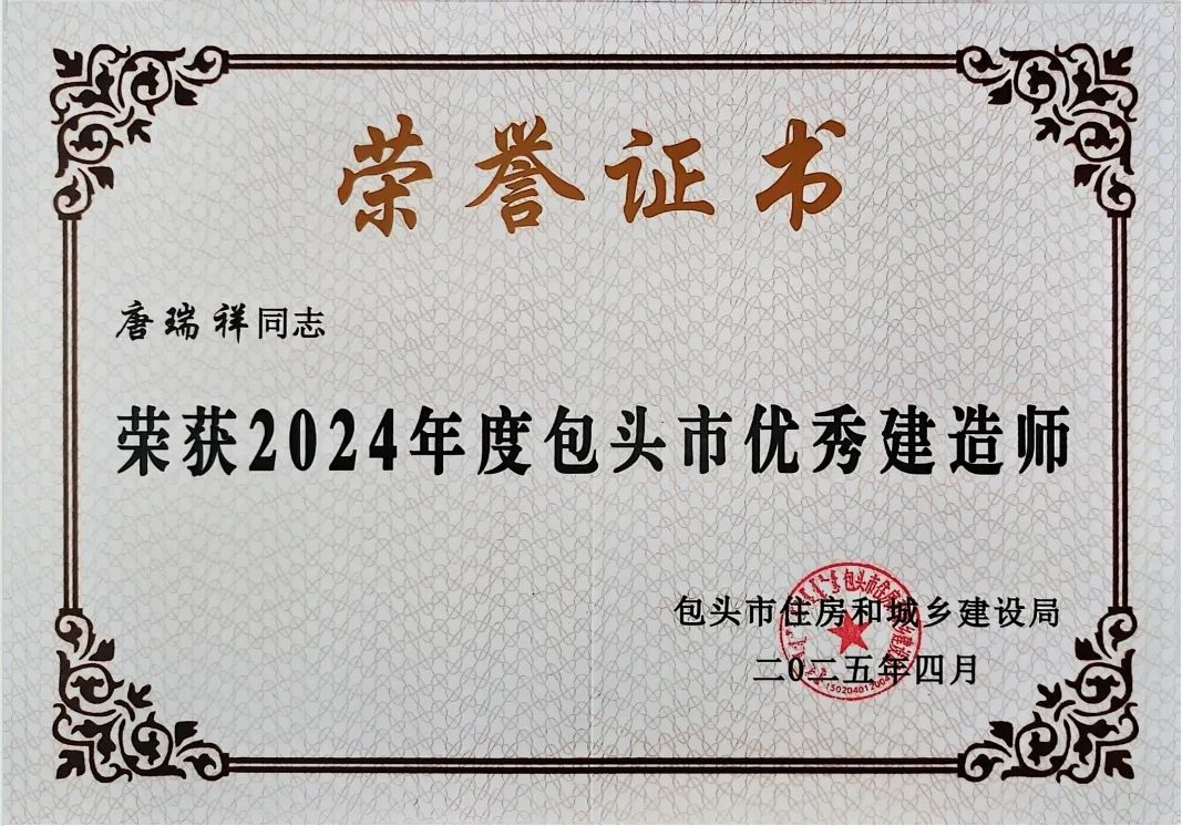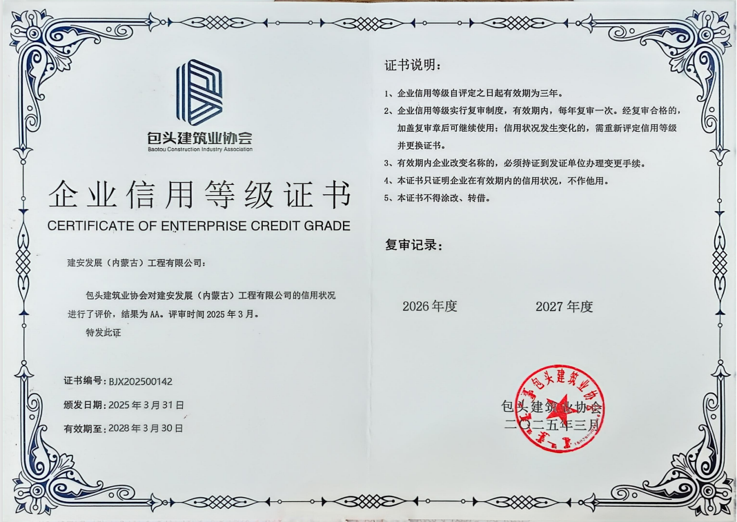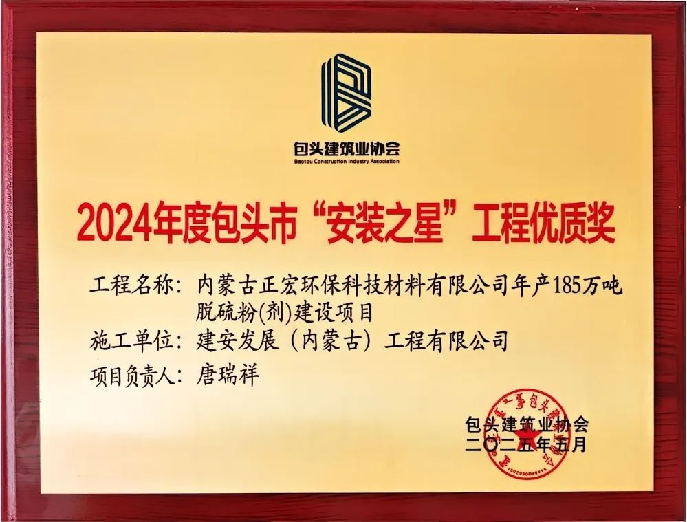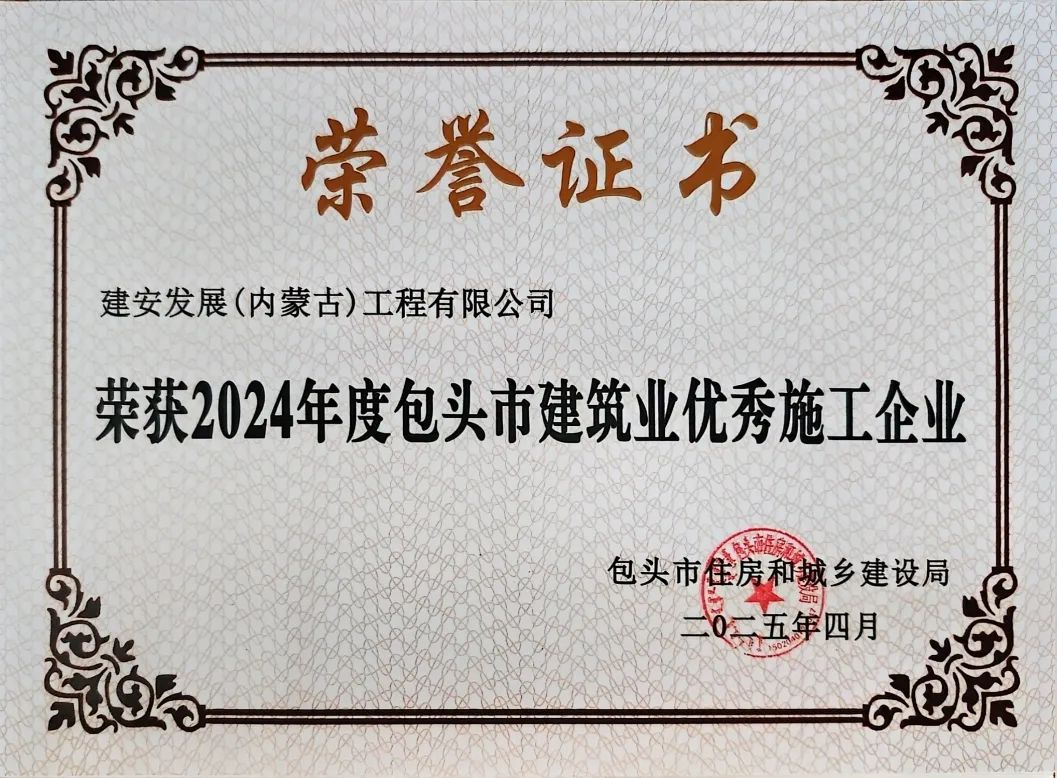 建安工程公司荣获“2024年度包头市建筑业优秀施工企业”,“2024年度包头市安装之星工程优质奖”,企业信用登记证书。两名建造师凭丰富经验与卓越管理能力摘得“优秀建造师”,以攻坚克难、稳推项目的表现树全员标杆。荣誉背后,是全体员工同心奋斗的成果。